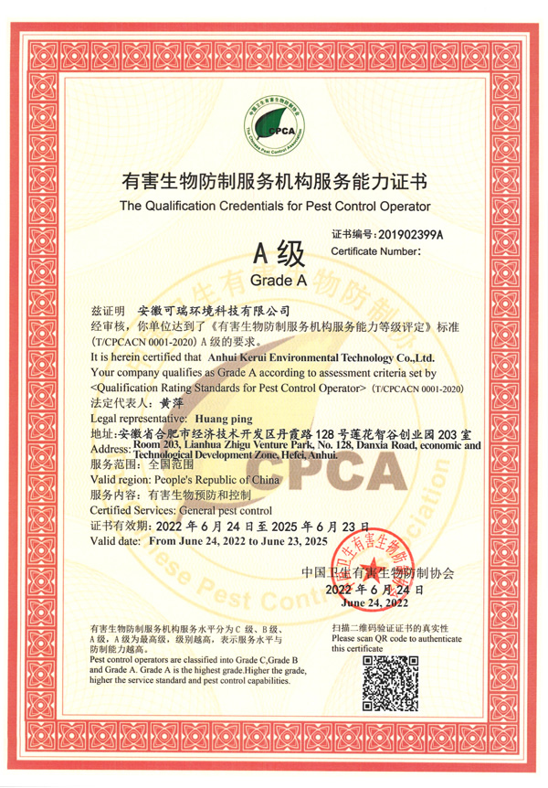 凱瑞蟲控是安徽可瑞環(huán)境科技有限公司旗下品牌,安徽可瑞環(huán)境科技有限公司成立于2014年,注冊(cè)資金500萬(wàn)元,全國(guó)A級(jí)資質(zhì),致力于蟲害風(fēng)險(xiǎn)管理并提供蟲害消殺、防疫消毒、有害生物防制、蟲害控制管理與監(jiān)測(cè)、衛(wèi)生防疫消毒、商業(yè)清洗清潔服務(wù)、空氣治理服務(wù)、環(huán)境綠化施工與養(yǎng)護(hù)、藥品和器械銷售、技術(shù)咨詢與培訓(xùn)等業(yè)務(wù)的服務(wù)性公司。公司是一家有行業(yè)資質(zhì)、注冊(cè)商標(biāo)及專利的公司。我們不參與各種擾亂市場(chǎng)秩序的低價(jià)競(jìng)爭(zhēng),堅(jiān)持以合理的價(jià)格、新穎的設(shè)備、優(yōu)質(zhì)的技術(shù)、完善的質(zhì)保體系和質(zhì)保措施,來對(duì)客戶進(jìn)行綜合的服務(wù)工作。公司本著...